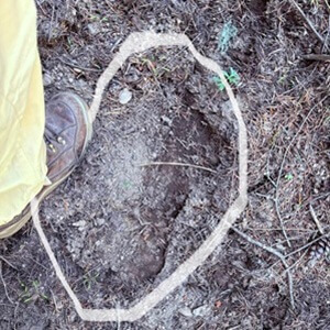 A listener writes “My wife, Sara, and I were hiking the West Metolius River Trail near Camp Sherman today (3/26/26) around 10:00 AM. It was about 34°F along the river when I noticed a set of unusual footprints. There were actually four impressions in total, but this one photographed the best the others were even larger.