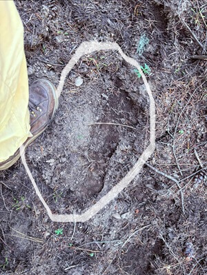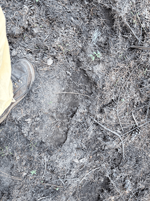 A listener writes “My wife, Sara, and I were hiking the West Metolius River Trail near Camp Sherman today (3/26/26) around 10:00 AM. It was about 34°F along the river when I noticed a set of unusual footprints. There were actually four impressions in total, but this one photographed the best the others were even larger.