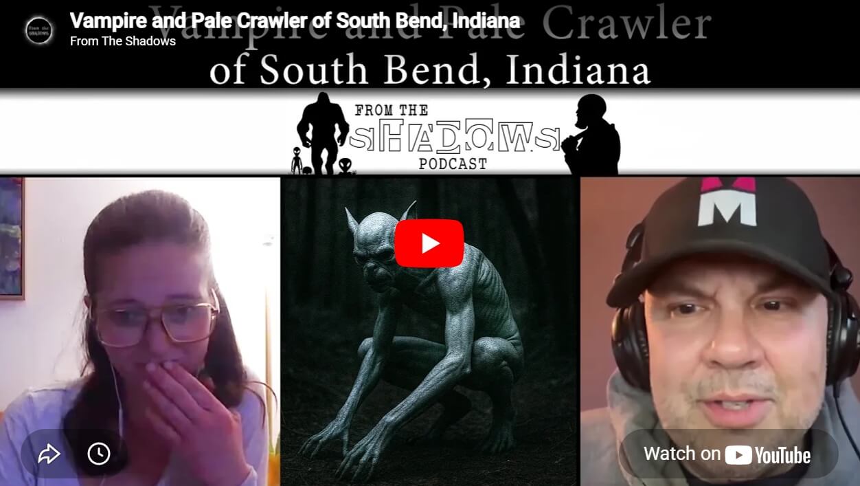 From The Shadows writes “A Vampire and a Pale Crawler are the subjects in this week’s midweek paranormal double interview episode from South Bend, Indiana. Luma joins us to share a sighting she had in the early morning hours only a few weeks ago. It shook her so bad she thought she was going crazy. Vaughn then tells us about an event that he can’t forget.