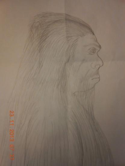 So I got to see a Sasquatch up close and personal. My window was down and I was no more than 20 feet from him. His face was human looking except that he had no chin and he had a somewhat heavy brow ridge. The nose was a human nose and was more European than African looking. The eyes were black, the skin was grey as was his hair and he had more or less human teeth…what was left of them. His teeth were in terrible condition. When he ran, his palms were down, not thumbs up like us, and when he stood his palms faced back rather than thumbs forward like a person. The arms looked a bit longer than a human but not more than half a hand length longer. Also since it was around one in the afternoon and I was looking south at him I could see the shape of his head through the hair in the sun. The hair sticks way up and makes him look like he has a pointy head but really the shape of the head is human. My guess and it is only a guess, is that he was about 7-8 feet tall. I didn’t have time to take a picture. It all happened so quickly.
