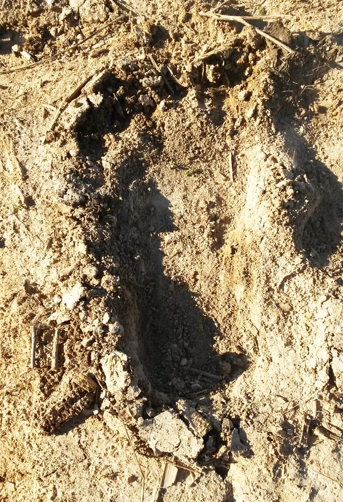 OTHER STORIES: I was told by a farmer after finding tracks in June of 2015, and after jokingly asking if he had seen any Bigfoot running around that he was scared by something big in his field one evening at dark and thought it was a man and went to run him off the property or see who it was as no one else would or is supposed to be out there, he drove his truck out towards him and said “it was the biggest guy he ever saw and he ran into the woods” but did get close enough to see him in the head lights and thought it odd he had a big heavy coat on..