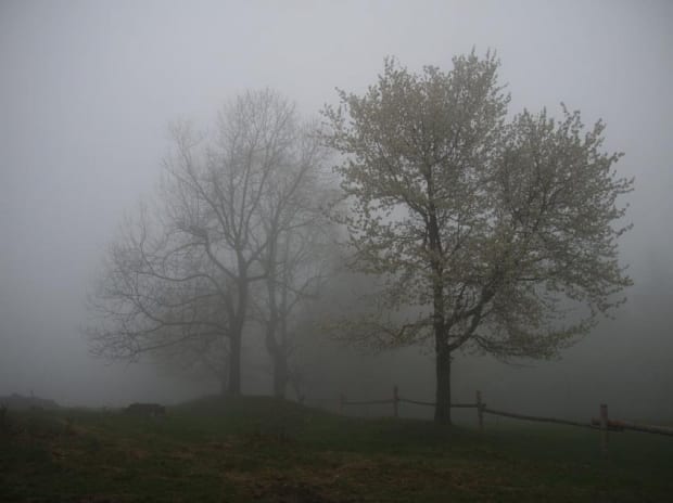 “He’s a pretty calm dog. We’re walking for a good 20 minutes when I start to get tired. So I stop and turn to go back the way we came, but Buddy stays put, staring down the trail and he won’t come even with me tugging on him. He is just staring.”