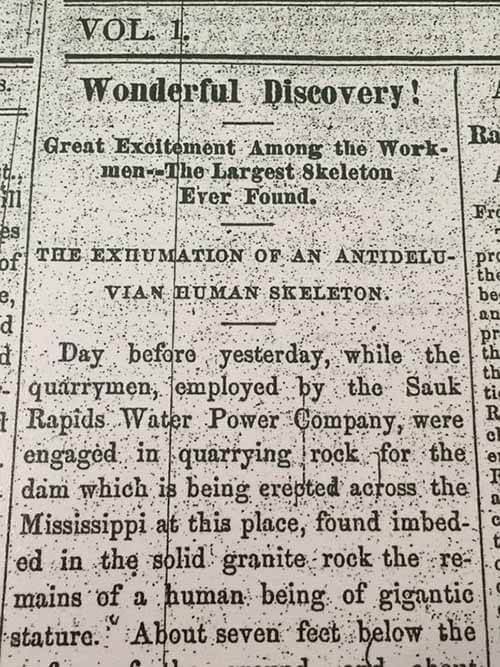 Nearly 150 years ago, a report surfaced that quarry workers with the Sauk Rapids Water Power Co. unearthed the remains of a 10-foot-tall giant along the shores of the Mississippi River.