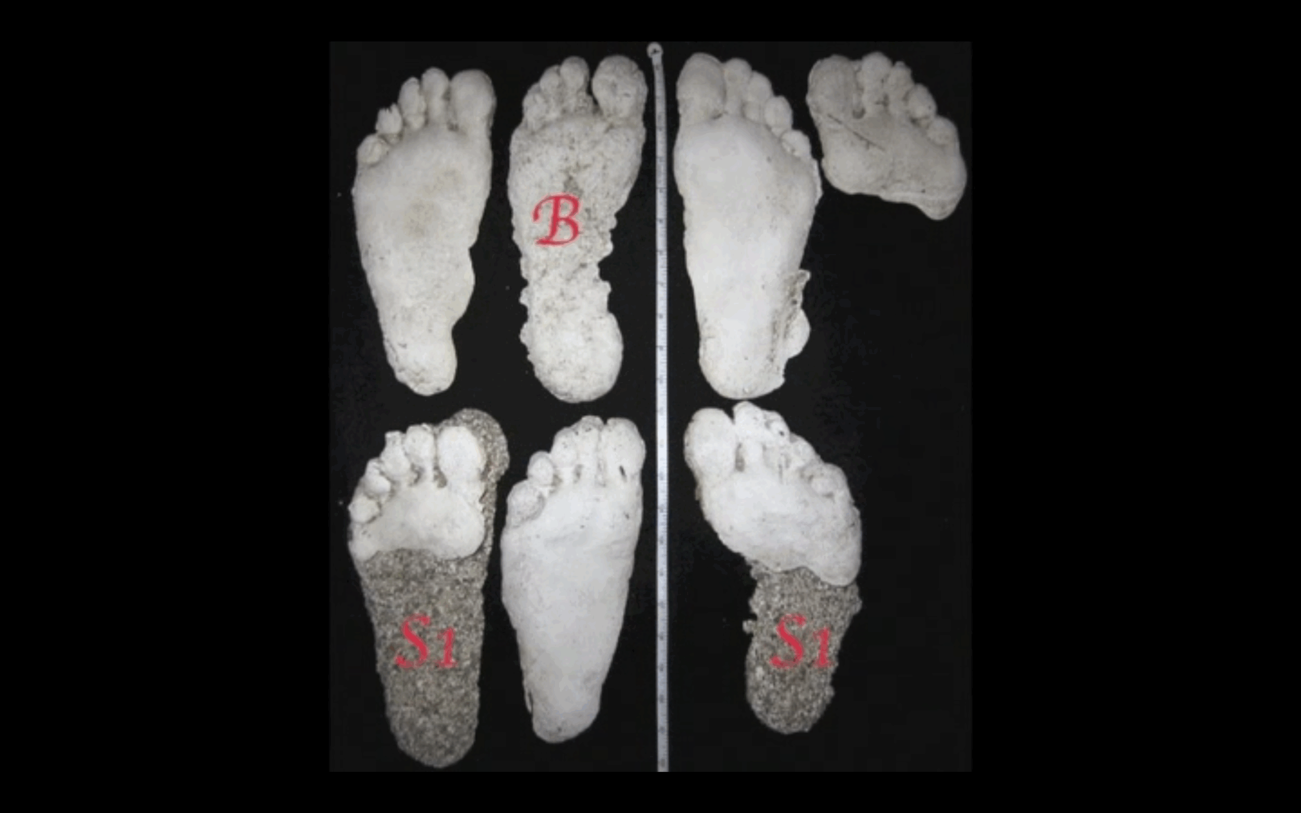those foot casts are of feet that have been wearing footwear for years. You can tell its the toes of a modern human who wears shoes because otherwise the toes wouldnt be squished up. google to see what a natural barefoot human foot looks like thats never seen a shoe. toes are splayed out.