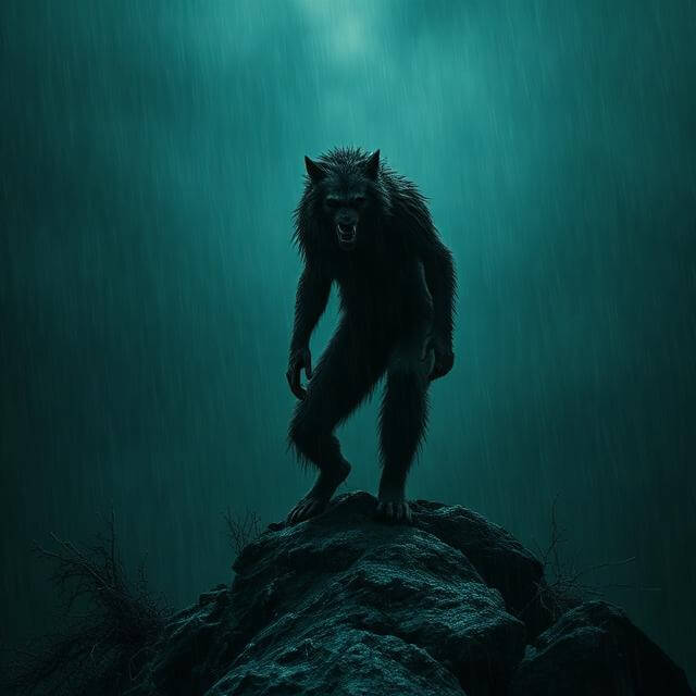 It was unmistakably canine, with a long snout and pointed ears rising above its skull. The body was covered in dark hair, thick through the shoulders and chest. It stood upright, easily seven feet tall, arms hanging loosely at its sides. Its legs bent backward like a dog’s, yet it balanced effortlessly.