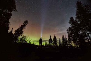 The first occurrence happened when we were just about to turn into the base camp parking lot. I was the passenger and while looking out the window i noticed a large glowing white light in the sky behind the trees. It appeared to be coming from the parking lot, which is a nice surprise because typically as night hikers, we usually show up to very dark parking lots. I didnt think anything of it until we parked in a very dark parking lot. I thought maybe the light was on a timer. Next, i was out of the car and stretching; walking around the lot with my rucksack on, getting used to the weight. I started to notice that the lot actually didnt have lights at all. This made sense to me from being up there so much, but this made the light we saw make no sense at all. It was huge; it was shining through tall pine trees on the edge of the road next to the lot so it was at least that high but as for depth of field, now i dont know. I assumed it was a 12” diameter dome light about 30 feet in the air, but when i realized it didnt come from a parking lot light, I thought well ok this means whatever it was couldve been much much larger and much farther away. I honestly cant say. A few dozen UFO jokes later and we were on the trail that would lead us to our climb.